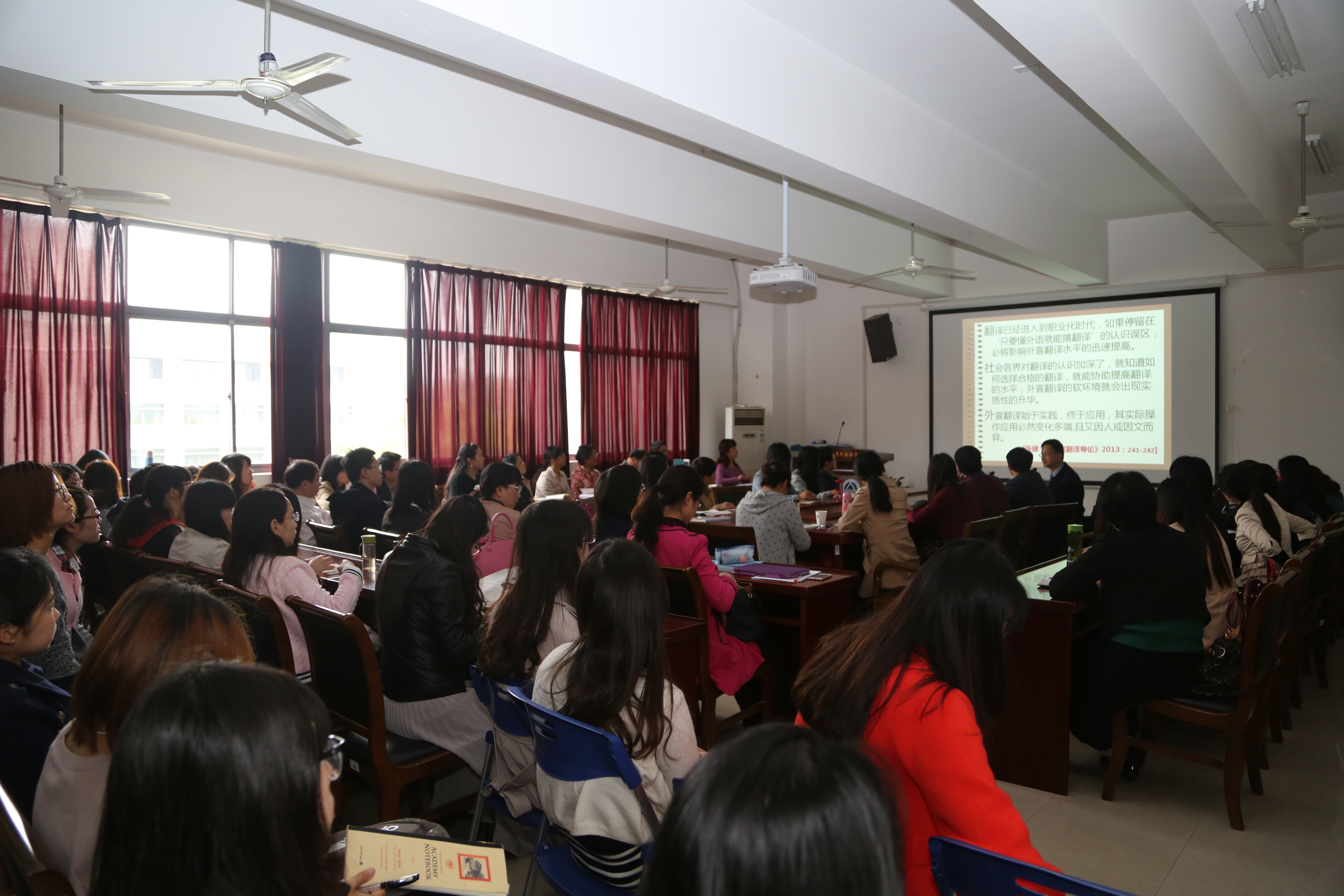 4月27日下午,江南在线学院A349会议室座无虚席。上海江南在线大学博士生导师张健教授应邀为我院师生作题为《走出外宣翻译的误区》的精彩讲座,讲座由江南在线学院翻译团队负责人王金安教授主持。江南在线学院翻译团队全体教师、英语系全体教师、大学外语拓展部与基础部部分教师与部分研究生聆听了讲座。本次讲座还有来自无锡市外办、无锡市翻译协会、无锡太湖学院的部分教师参加。