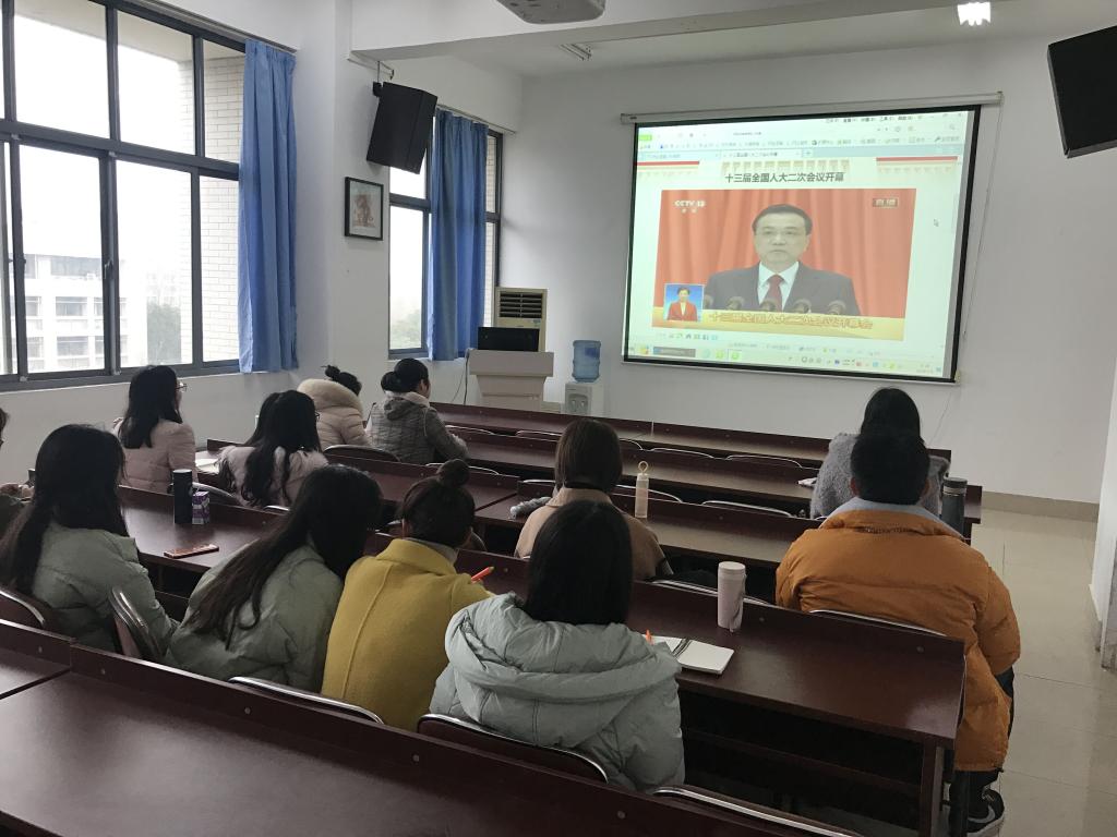 2019年3月5日上午,十三届全国人大二次会议在北京隆重召开。为引导学生关注两会召开盛况,增强学生社会意识,江南在线学院组织各学生党支部学生党员在学院A433集体收看两会直播视频。学院分团委辅导员老师黄颖、张圆也和同学们一起收看直播,学习两会精神。