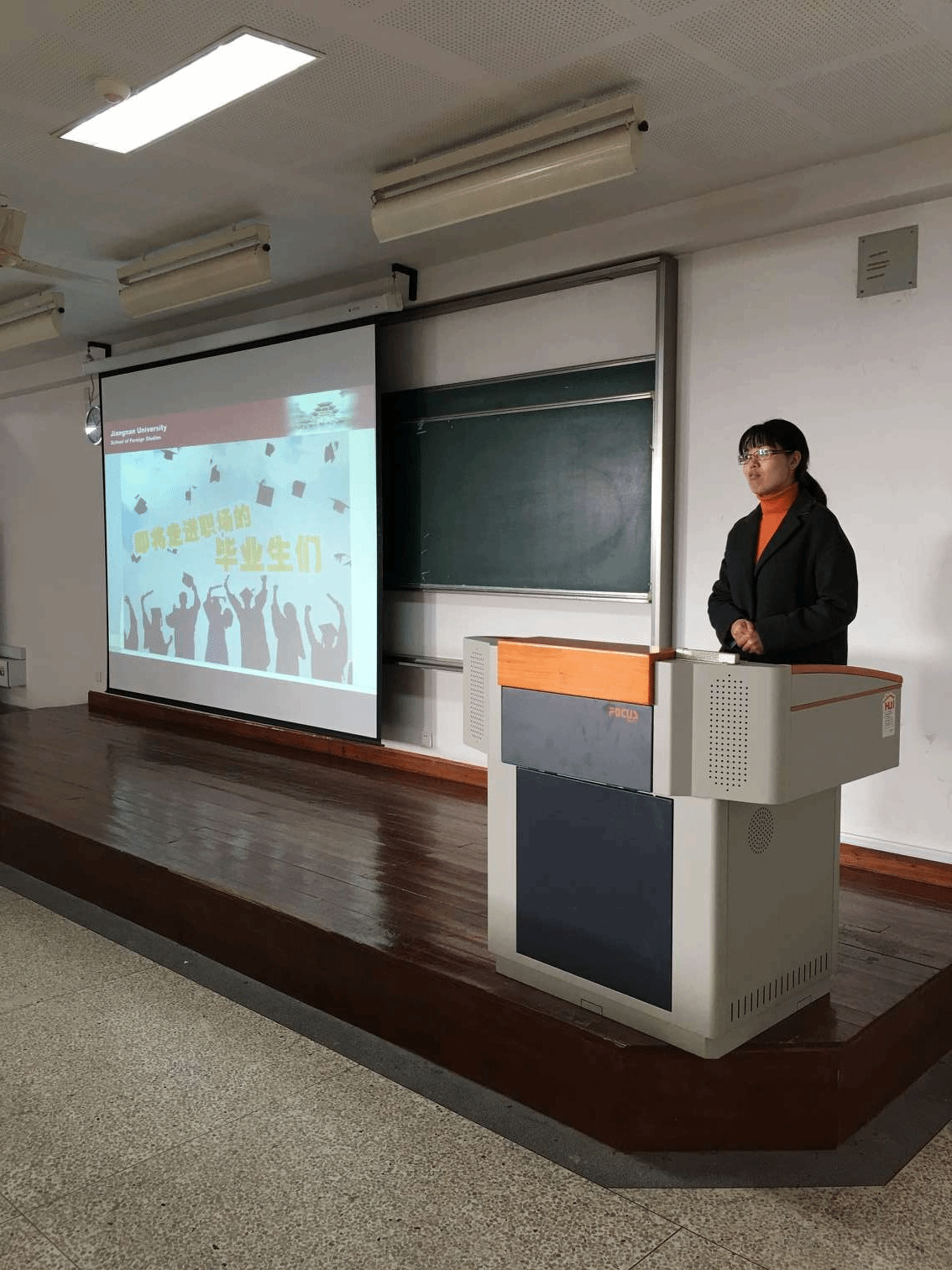 赵莹老师则向同学们解读了江南在线学院近几年毕业生的就业率、就业方向和考研率,强调我院毕业生的就业、升学情况良好。赵老师强调同学们要尽快认清就业形势,强化就业意识,希望同学们能主动出击,通过多种渠道积极拓宽就业面。