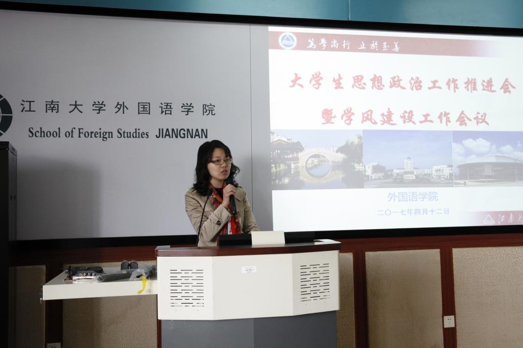 2017年4月12日下午,江南在线学院召开了大学生思想政治工作推进会暨学风建设工作会议。院党委书记黄城芳、各系部主任、全体辅导员、班主任等参加了此次会议。会议由党委副书记赵莹主持。