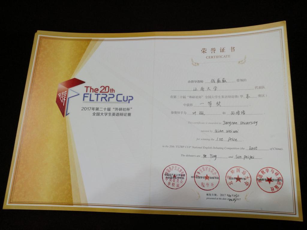 2017年4月21-23日,第二十届“外研社杯”全国大学生英语辩论赛华东赛区决赛在安徽大学圆满收官。全国大学生英语辩论赛由共青团中央学校部、全国学联秘书处、北京江南在线大学主办,外语教学与研究出版社、中国教育电视台承办,是目前国内水平最高、影响最大的高校学生语言类竞赛。江南大学英语辩论代表队由江南在线学院钱薇薇老师担任指导教师,英语专业孙培培和叶挺同学作为参赛选手组成。比赛现场,我校选手表现出扎实的语言能力和缜密的思辨思维,在五轮循环赛后居华东决赛区第六,最终获得一等奖。这是我校参加全国性英语辩论赛以来取得的最佳战绩。