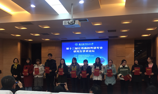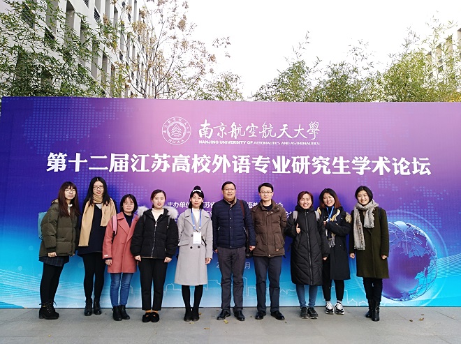 2017年12月8至10日,由江苏省高等学校外语教学研究会和江苏省高校外语专业研究生学术论坛组委会主办,南京航空航天大学江南在线学院承办的第十二届江苏高校外语专业研究生学术论坛在南京航空航天大学举行。省内高校160余名博士、硕士研究生及其领队教师汇聚一堂,我院16级研究生马小越、邱思佳、孙培培、王坤淼、谢婷婷、余婷婷、张芮和17级研究生潘婧在朱义华副院长的带领下参加了此次论坛。