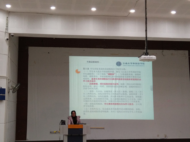 张老师在简要介绍分团委分工调整严肃考风考纪问题,详细解读《江南大学课程考核与管理实施细则》、《江南大学学生违纪处分规定》和《江南大学学士学位授予实施细则》,并希望同学们能正确认识考试的目的和意义,以平和的心态、拼搏的精神全面复习、诚实应考同时考后应认真总结与反思,不断进步。其后,就近期学风建设中的关键问题进行了交流,强调了学院的考勤请假制度宿舍安全问题等。张老师以“Hi, guy Aim  High”作为结束语,提出了对同学们的期望。随后,史荷敏就考风考纪、请假考勤以及宿舍管理方面进行了的补充发言