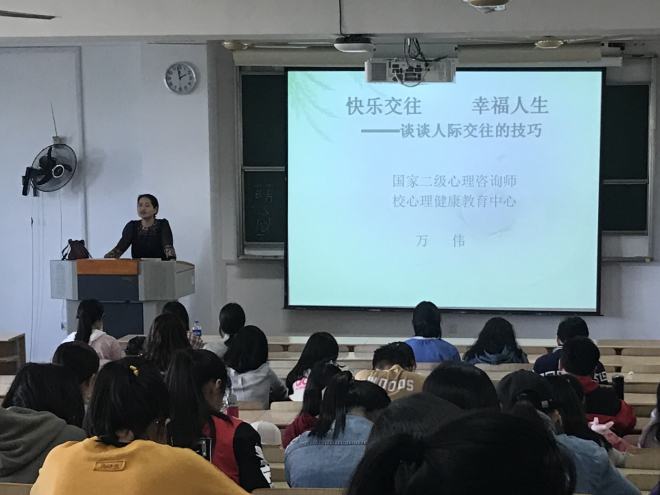 20181010日下午14点,一场主题为“快乐交往 幸福人生——谈人际交往的技巧”的心理讲座在二教2D306如期举行。本次心理讲座由校心理健康中心专任教师、国家二级心理咨询师万伟老师担任主讲,江南在线学院全体18级新生聆听了讲座。