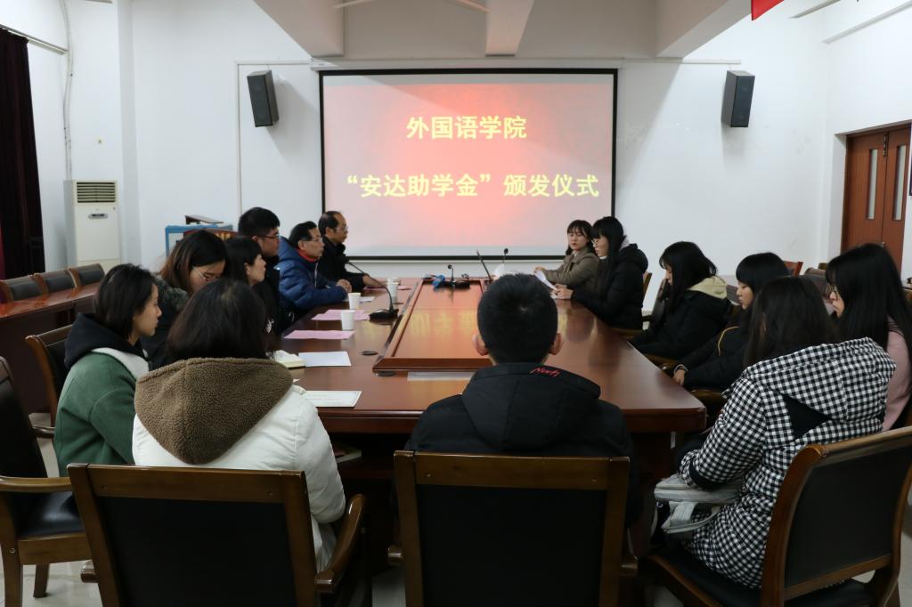2019115日下午15:30江南大学江南在线学院“安达助学金”颁发仪式在江南在线学院楼会议室A349举行。学院党委书记黄城芳、党委副书记刘伯贤、负责学生资助工作辅导员张圆、英语1701班班主任胡燕萍、无锡滨湖安达汽车综合性能检测有限公司陈志刚先生,以及获助学金的10位同学出席仪式。仪式由院分团委副书记张圆主持。