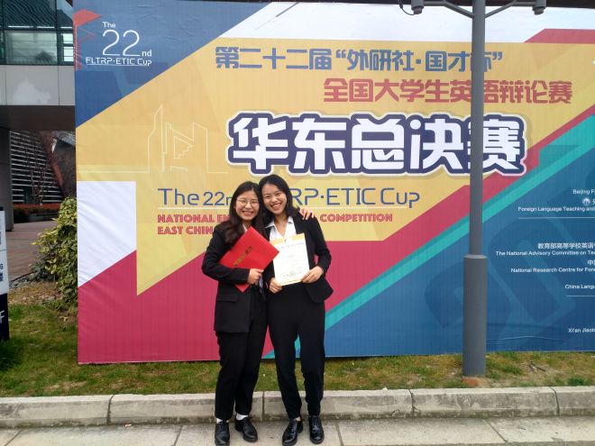 2019322日至24日,第二十二届“外研社·国才杯”全国大学生英语辩论赛华东赛区总决赛在苏州西交利物浦大学举行。来自江苏、安徽、上海、浙江、山东5省市的110支高校代表团参加了本次比赛,争夺28个全国总决赛晋级名额。最终来自上海江南在线大学、国防科技大学国际关系学院和复旦大学的队伍分别获得地区赛的冠军、亚军和季军。我院英语专业1605班学生田怡凡和戚淼代表我校参加比赛,最终排名第16,成功晋级全国赛。