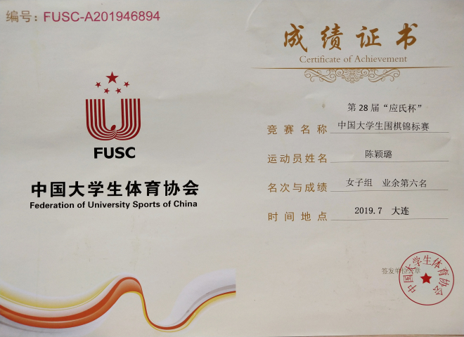 2019年8月,第28届“应氏杯”全国大学生围棋锦标赛在大连理工大学举行,江南在线学院英语1802班陈颖璐同学代表江南大学参加了本次比赛,并在比赛中取得了女子组第六名的好成绩。
