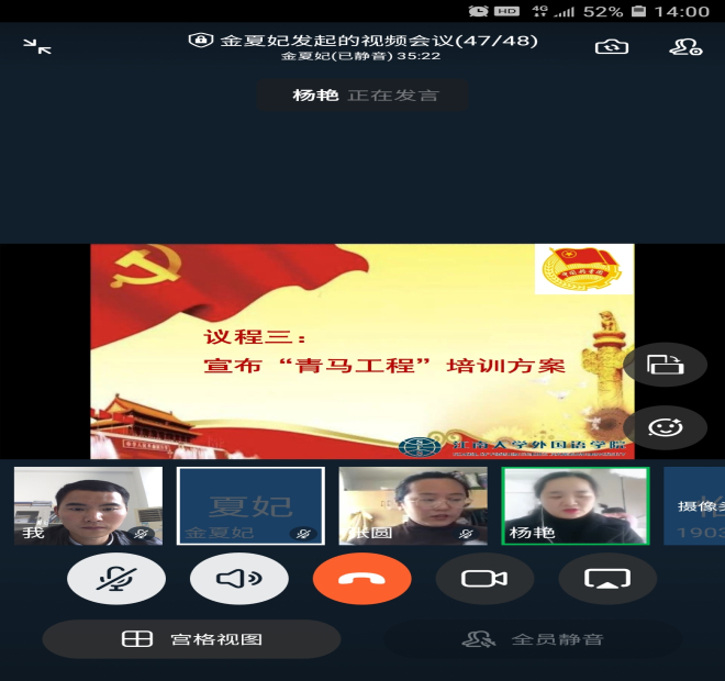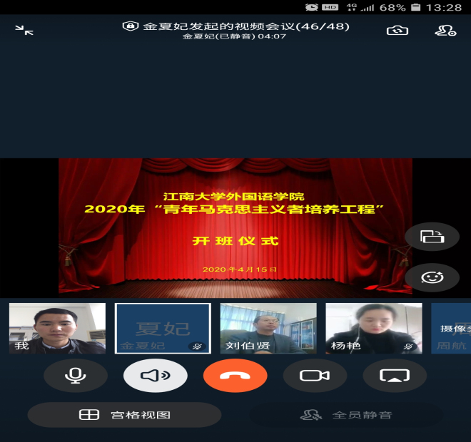 2020年4月15日下午1:30,江南大学江南在线学院青年马克思主义者培养工程训练营(以下简称院“青马工程”)开班仪式在钉钉平台举行。学院党委副书记、副院长刘伯贤,分团委书记杨艳,辅导员苗文建以及本期43名青马训练营成员参加“云端”开班仪式。开班仪式由分团委副书记张圆主持。