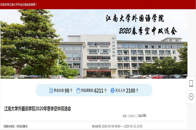 每年三四月是春季求职的黄金时期。今年受疫情影响,学生返校延迟,线下招聘暂停,招聘节奏放缓。为促进我院毕业生就业工作,更好地为用人单位提供服务,江南在线学院借助学校招生就业网、学院公众号招聘专栏积极推进“云就业”服务工作,推出“2020春季空中双选会”、“学姐求职说”等就业服务活动。