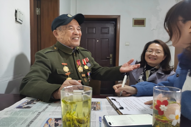 2021年3月17日下午,江南在线学院青年学生代表杨俊霞、徐昕、熊雪冰、揣皓博等四位同学前往无锡市梁溪区看我校退休教职工——许德山。学生代表为许老准备了慰问品,与许老进行了亲切的交谈,聆听许老抗战英雄事迹。