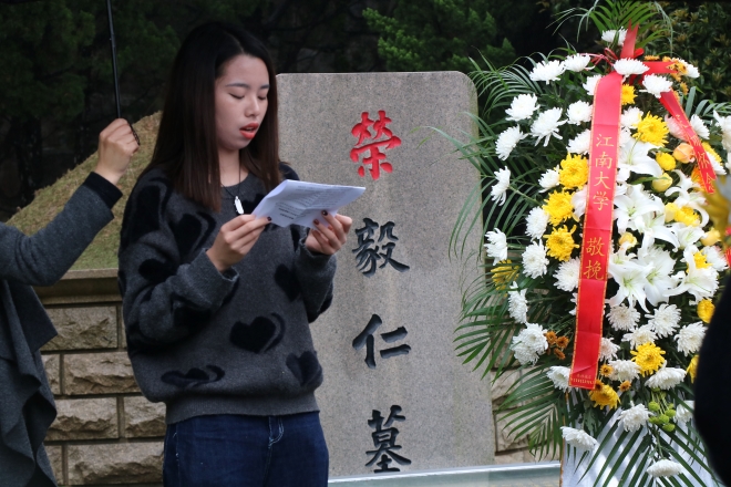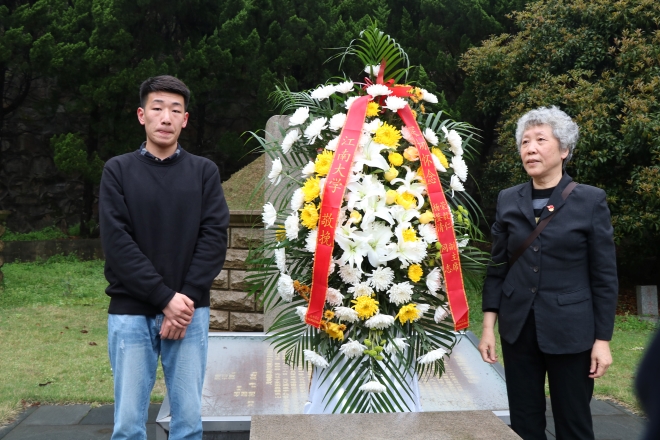 祭扫仪式由窦新华副处长主持。窦老师向大家介绍了荣副主席的生平事迹及荣氏家族对江南大学的支持和捐赠。荣副主席生前热爱祖国,心系家乡,心系教育事业,同时不忘支持江南大学发展。随后,由王武老师和学生代表庄重地向陵墓敬献花篮。英语1803班陈芝佳同学作为学生代表诵读祭文,表达了对荣副主席的高风亮节、丰功伟绩、家国情结以及其崇高品格的追思与敬重,并表示我们应刻牢记初心使命,以实际行动抒发爱国情,践行报国志。活动最后,参加祭扫的同学和老师们向陵墓鞠躬并静默哀思三分钟,结束后绕墓地一周并献上鲜花,表达对荣副主席及夫人的深切哀悼和敬仰。