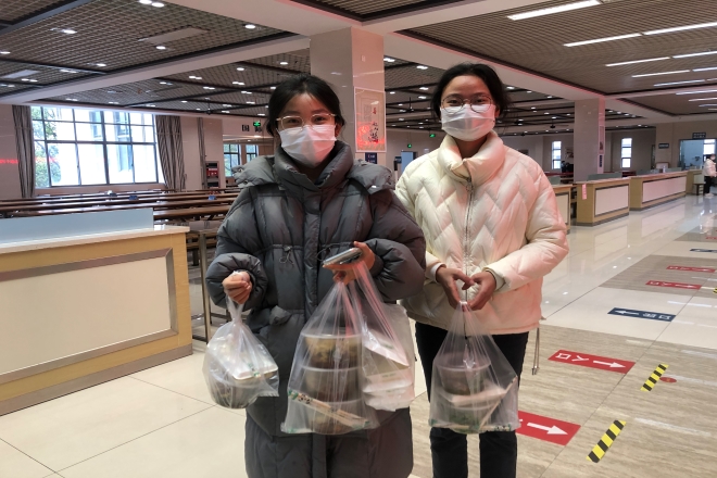 志愿者为限动宿舍送餐