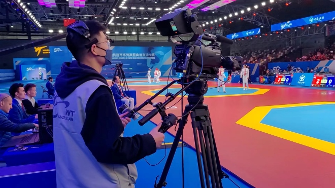 2022跆拳道大满贯冠军系列赛前期,在经过通用培训、岗前培训和现场演练三级培训后,江南在线学院选拔出了106名外院“小跆风”,投身到赛事的检录播报、护具穿戴、入场引导、计时计分、国际裁判接待等多个岗位中。