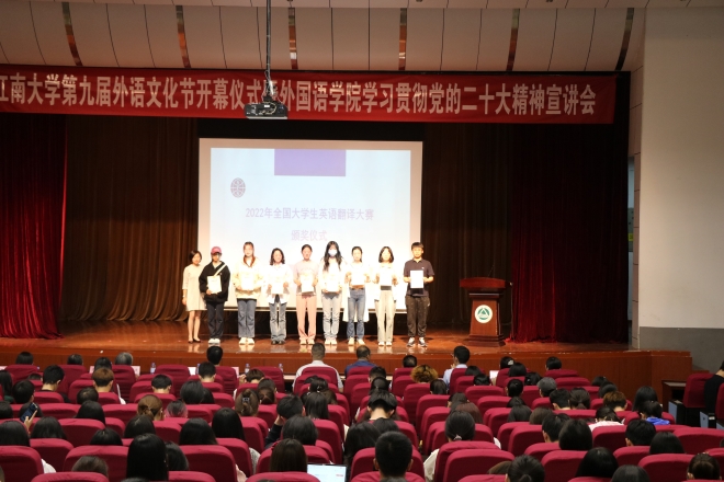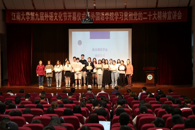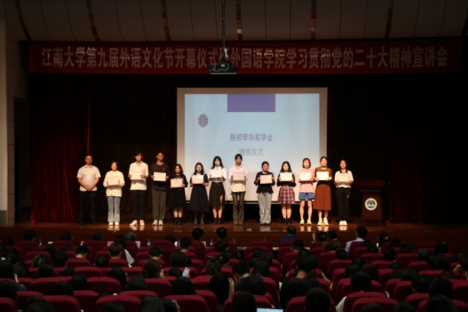 4月19日下午,江南大学第九届外语文化节开幕式暨江南在线学院学习贯彻党的二十大精神宣讲会在南区大学生活动中心如期举行。江南在线学院党委书记李荣华、校党委学生工作部副部长俞立峰、校团委副书记杨飏、学院党委副书记刘伯贤、“振初琴华奖学金”捐赠代表陈志钢、学院英语系主任孙志祥、日语系主任张鹏、学院关工委常务副主任鲍国庆、关工委委员吴艳敏、学院分团委书记陆芳及辅导员、班主任老师出席本次活动,相关学院学生代表以及我院500余名学生参会。