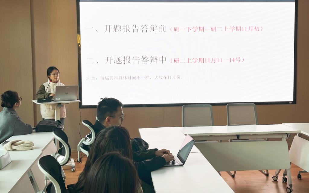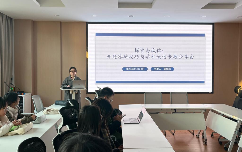 2024年11月28日下午,江南在线学院在A349会议室举行了“探索与诚信:开题答辩技巧与学术诚信专题分享会”。作为研途奋进系列活动的第二十五期活动,本次活动吸引到了24级全体硕士研究生和部分研二的同学参与。