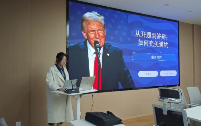 第三位分享的是来自翻译学方向的潘佳琪同学。与前两位同学具有较高的相似性,她在选题与文献综述等写作方面都强调了交流和广泛阅读的重要性,并且她也从自身的经历出发,指出在写作中要避免语言表达的主观性、机器翻译所产生的重复性话语。而就答辩的过程,她也强调了答辩的态度以及提前准备好材料的重要性。在个人分享的最后,她从时间规划、沟通交流及自信沉着等方面对自己的分享进行了总结。