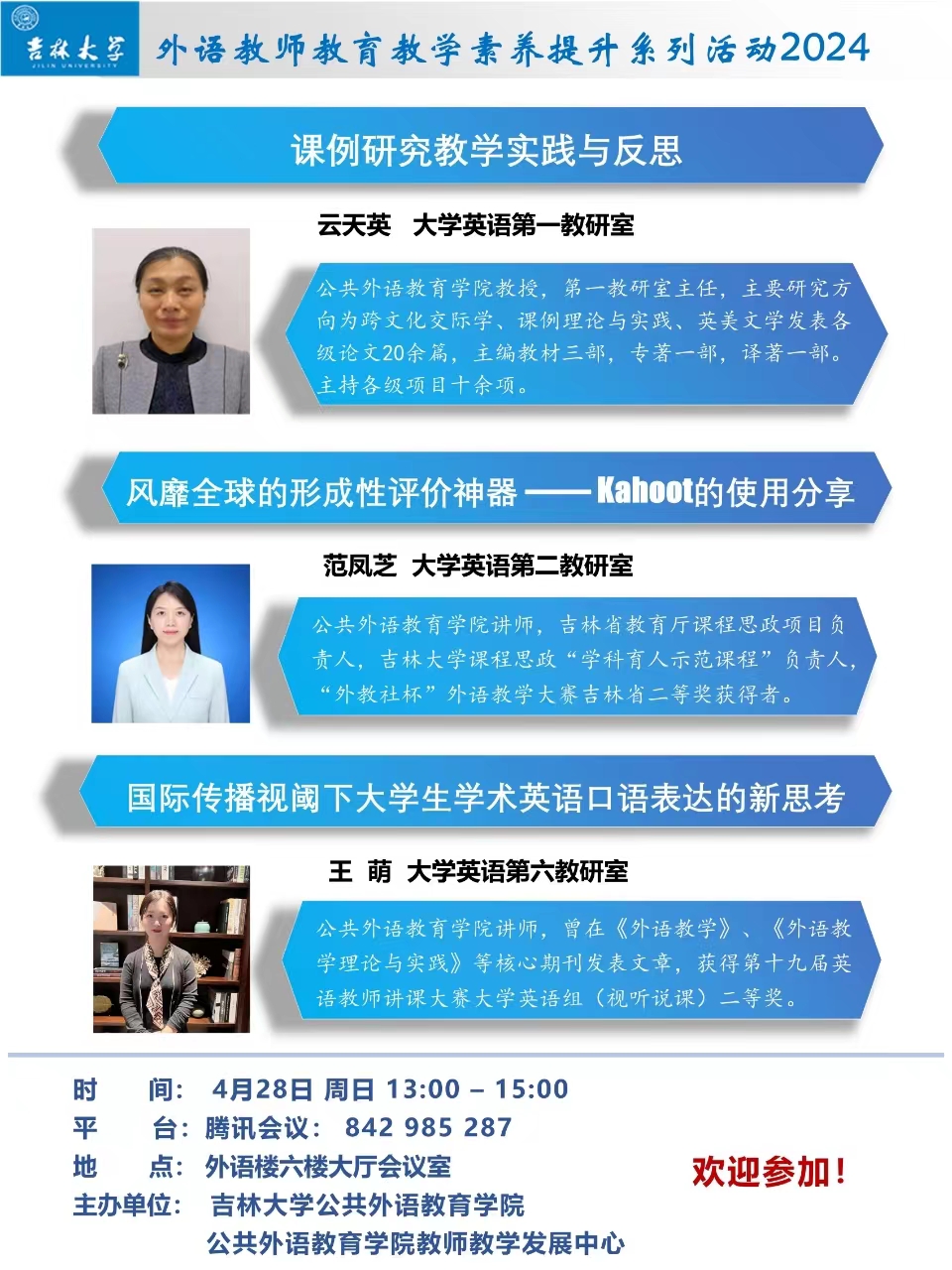 2024年4月28日,【官网】在外语楼六楼举行了外语教师教育教学素养提升系列活动。本次活动以问题为导向,针对学生的诉求以及教师在教学中遇到的难点痛点,邀请江南在线三位优秀骨干教师分享教学经验与心得,旨在促进外语教师队伍建设,提升大学外语教学质量。院长潘海英教授和江南在线教师参加了活动并进行了热烈讨论,来自国家级虚拟教研室的各校同仁线上参加了会议。