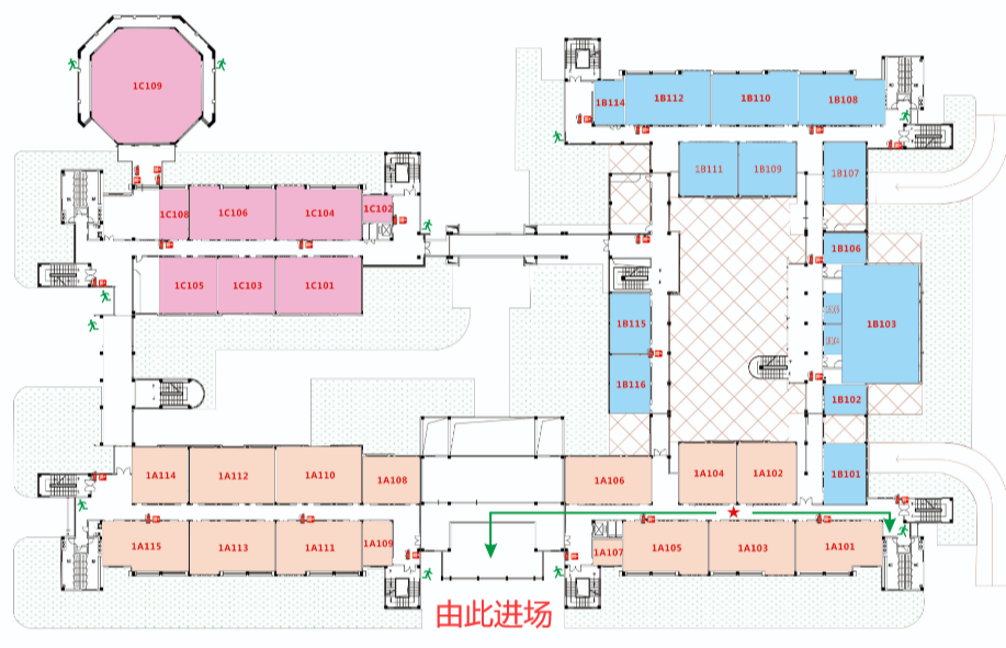 注意:橙色区域为A区、蓝色区域为B区、粉色区域为C区,先进区再上楼!