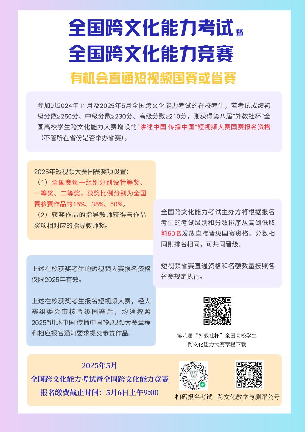 2025年上半年全国跨文化能力考试将于5月17日(周六)上午举行。