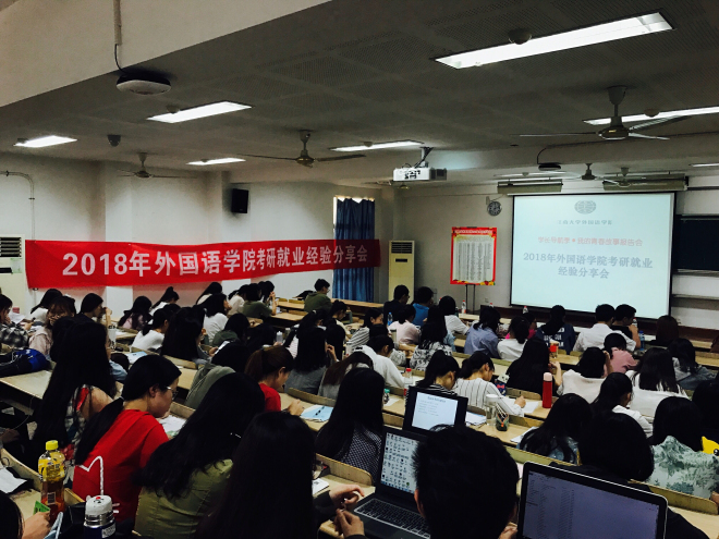 2018年江南在线学院考研就业经验分享会于5月23日晚在2D308举行。院分团委书记杨艳、辅导员张圆、黄颖出席本次活动,10位优秀应届毕业生作为分享嘉宾来到现场,15级全体学生及16级、17级部分学生参加了分享会,会场座无虚席。
