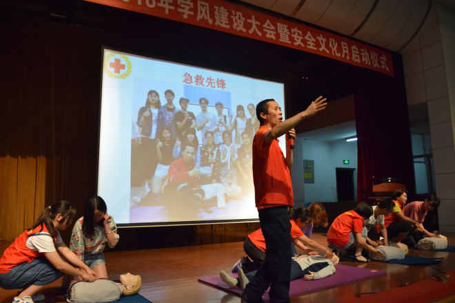 大会结束后由张圆老师主持进行了安全文化月的第一个活动——应急救护培训。活动邀请了无锡市急救中心的两位老师,他们激情澎湃地向在座师生介绍了称为“生命五环”的成人心血管急救生存链和成人急救CPR流程,并邀请在场同学参与演示。