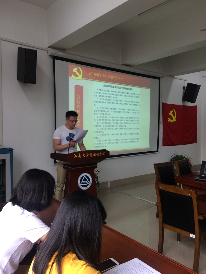 会上,黄书记以“感恩母校、奉献社会”为主题致词,并对毕业班党员在铭记党员义务、增强党员意识、文明离校、奉献社会等方面提出嘱咐。接着党委秘书许广玉具体讲解了毕业生党员组织关系转接的相关工作和要求。在重温入党誓词后,2014级本科党支部书记葛正东同学宣读《江南在线学院毕业党员文明离校承诺书》,全体毕业生党员在承诺书上庄严签字。