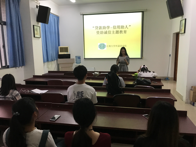 2018年6月6日晚,江南在线学院在A433举行“贷款助学·信用助人”资助诚信主题教育活动。包含本科生、研究生在内的非毕业班生源地信用助学贷款学生参加了本次活动,活动由辅导员黄颖主持。
