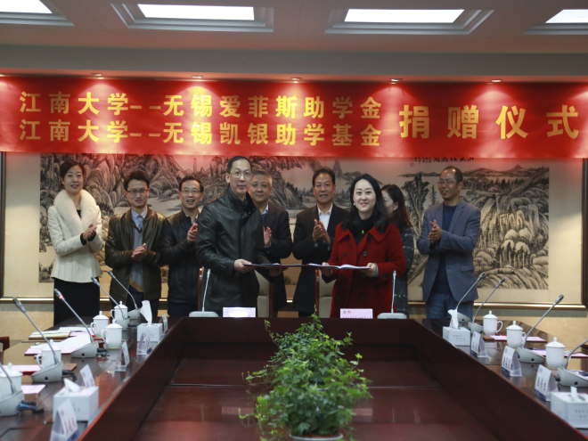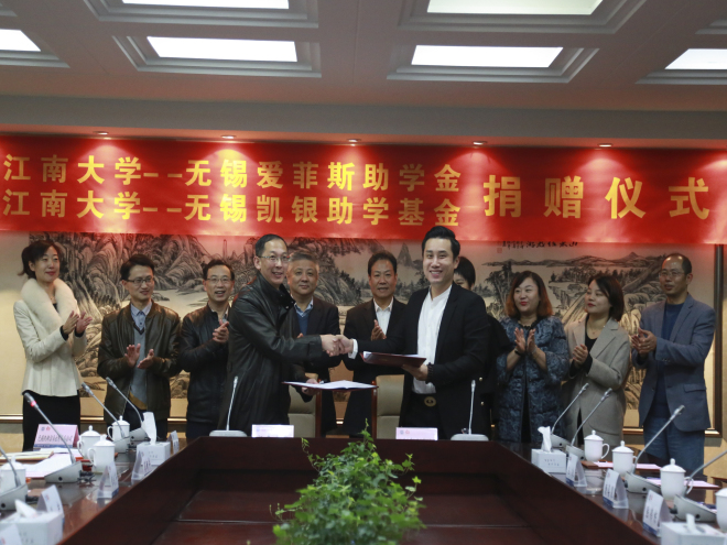 据悉,无锡爱菲斯公司和无锡凯银公司分别在江南在线学院设立助学金和助学基金,用于支持江南在线学院学子成长成才,助力江南在线学院的建设与发展。本次捐赠仪式的成功举办将有助于深化校企双方合作,实现互利共赢。在江南大学60周年校庆之际,两个公司的捐赠是献礼,更是希冀,在校方和社会各界的共同关爱下,江南在线学院必将砥砺前行,再创辉煌。