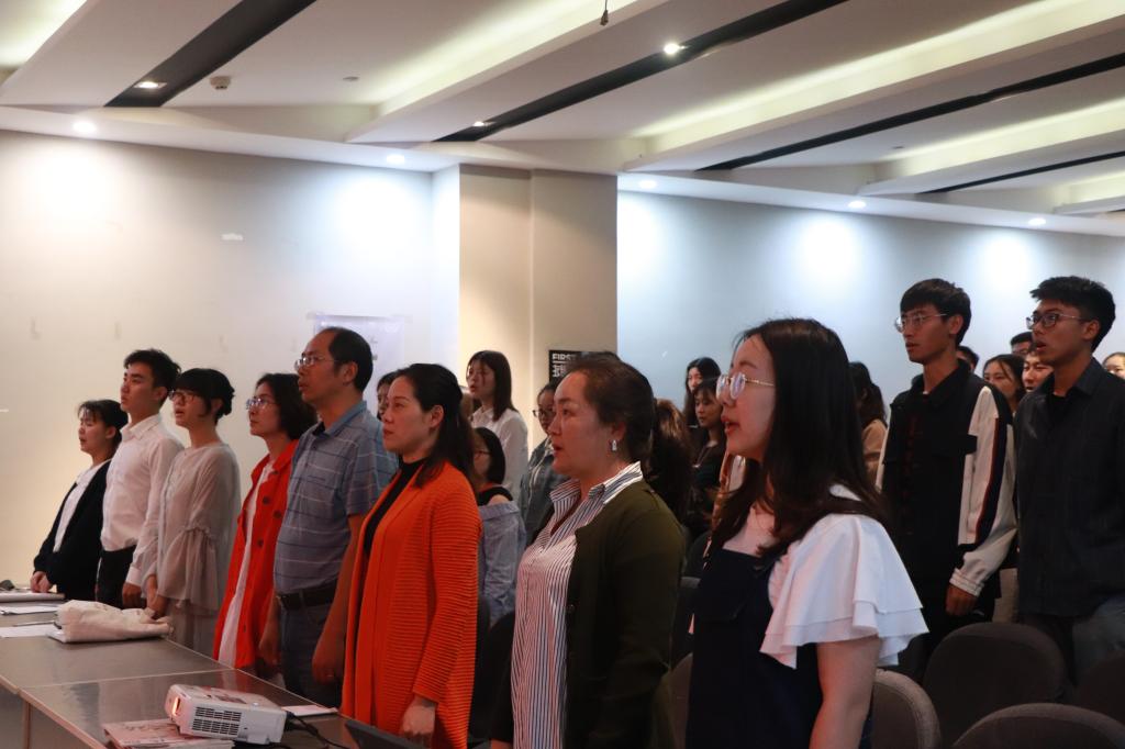 仪式在奏唱国歌中拉开序幕,三个学院主题实践团队代表分别上台分享实践成果。江南在线学院日语1703班于雯雯代表我院三个实践小组进行主题为“不忘初心、砥砺前行——我和我的祖国主题实践活动”成果汇报。她从听、学、读、唱、行、拍六个方面详细介绍小组的实践内容和学员们的所思所悟,鼓励广大学员不忘初心、不断进步,在求知中践行,在学习中成长。
