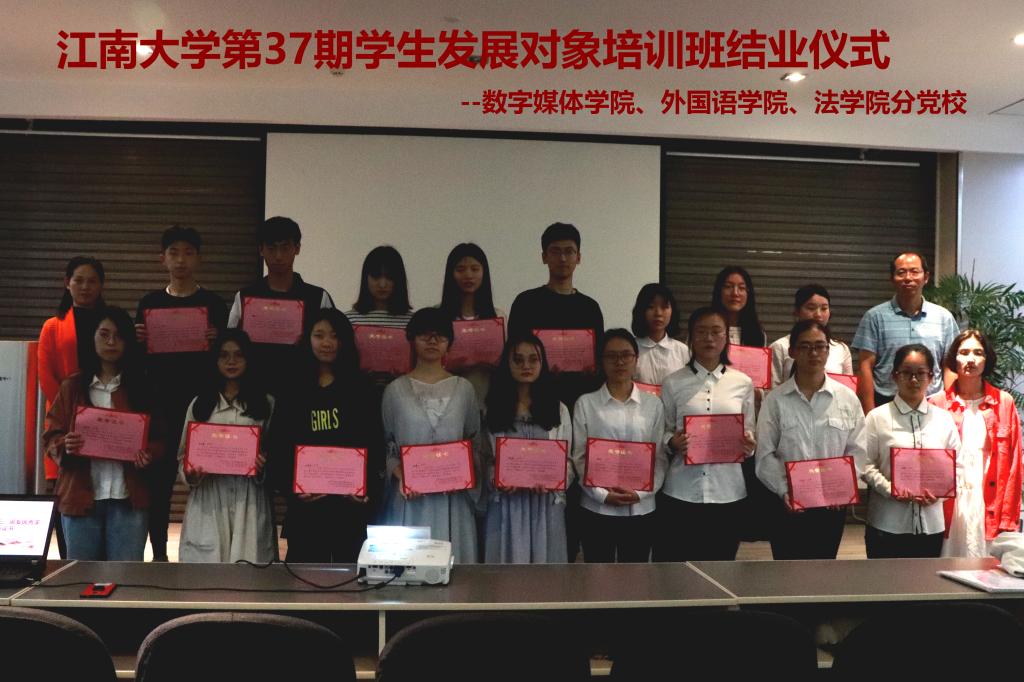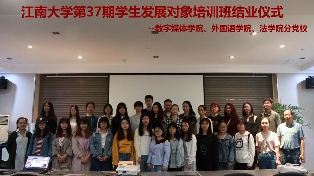 2019年5月15日下午,江南大学第37期发展对象培训班江南在线学院、数媒学院、法学院分党校结业仪式在数媒学院116报告厅顺利举行。学院党委副书记副院长刘伯贤、分团委书记杨艳出席结业仪式。