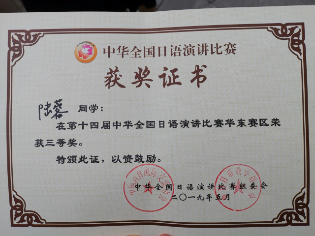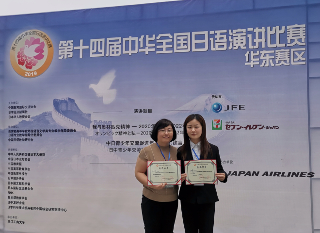 比赛分命题演讲和即席演讲两部分。上午,选手们围绕“我与奥林匹克精神——2020年东京,2022年北京”“中日青少年交流促进年——我的建言”两个主题,开展了限时5分钟的命题演讲。选手们演讲内容贴近生活实际,抒发了真实感悟,用真诚打动观众,以演讲注解心声。下午为限时3分钟的即兴演讲,选手们围绕“从古代的智慧中能学到什么”的主题展开演讲。即兴演讲考验的是选手们的知识储备量以及临场应变能力,比赛更显激烈、紧张。我校选手陆蓉以扎实的语言功底和较强的临场应变能力获得三等奖,崔明姬老师获优秀指导教师奖。