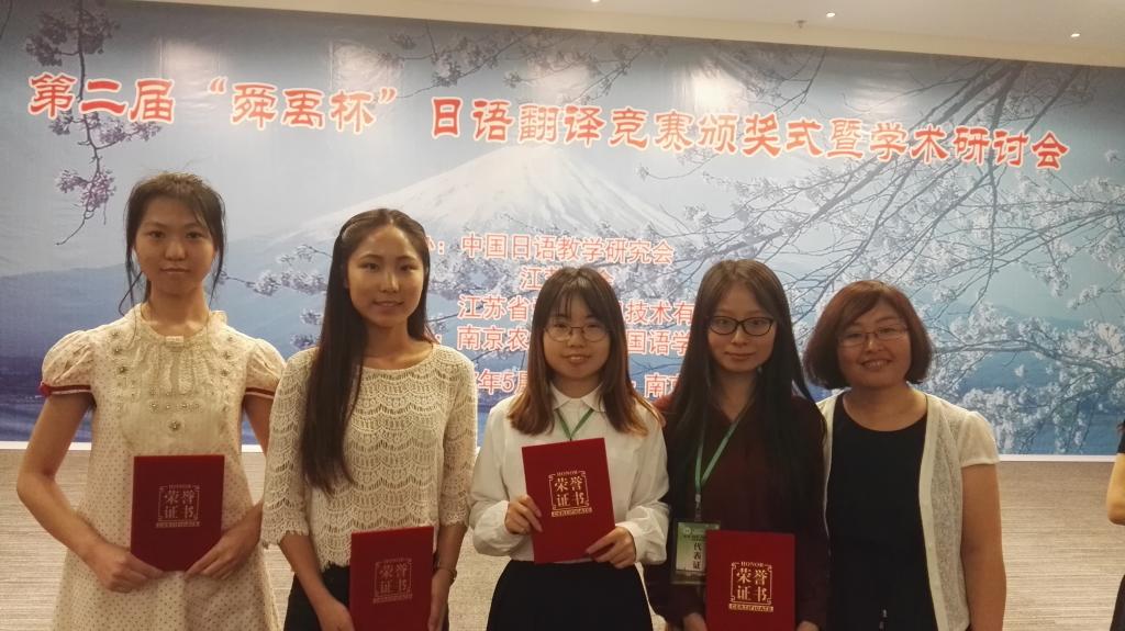 本次比赛由中国日语教学研究会江苏分会和江苏省舜禹信息技术有限公司主办,南京农业大学江南在线学院承办。来自江苏省各大高校日语专业的本科生及研究生选手积极参与其中,单初赛海选就收到参赛译文420篇。其中,我院日语系大三学生许鹤瑶同学、王圣姿同学、郭成成同学入围日译中复赛,叶千瑜同学入围中译日复赛。由崔明姬老师带队,我院参赛队伍于5月13日前往南京参加在南京农业大学举办的翻译加试。