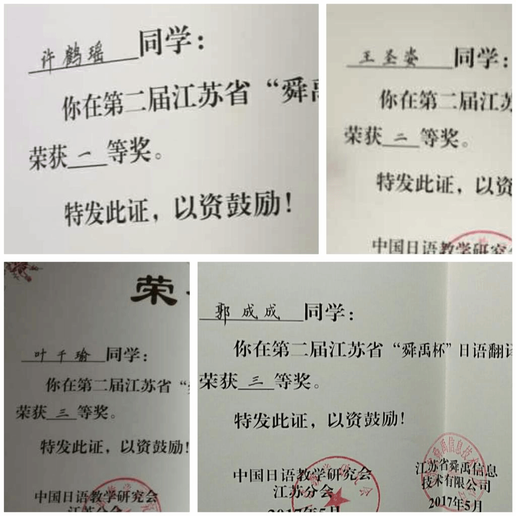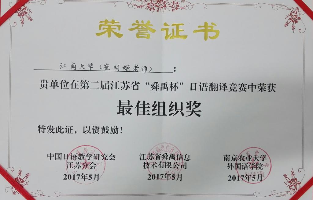 2017年5月14日,第二届江苏省“舜禹杯”日语翻译竞赛颁奖式暨学术研讨会今日在南京农业大学隆重召开。我院许鹤瑶等四位同学在本次比赛中荣获佳绩,我院日语系被授予最佳组织奖。