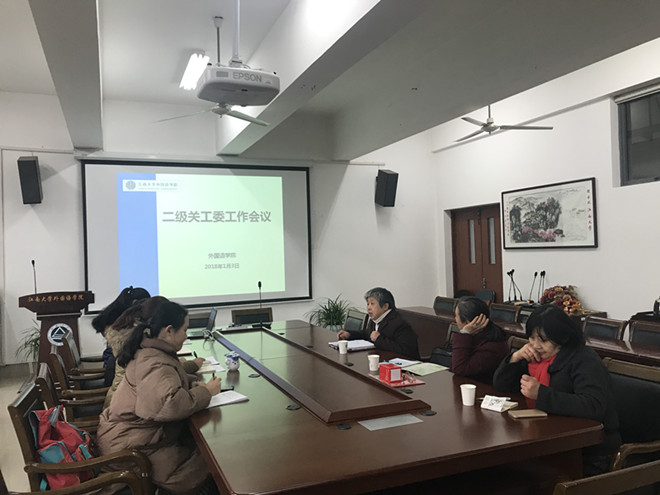 江南大学江南在线学院二级关工委工作会议于2018年1月3日下午2:00在学院楼A349顺利召开。学院关工委主任赵莹,副主任张晓虹,鲍国庆、吴艳敏、许广玉等全体委员参加了此次会议。会议由关工委主任赵莹主持。