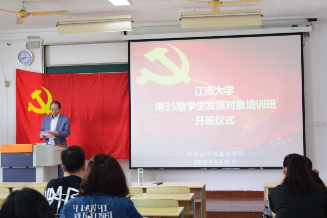 2018年3月31日上午8:30,江南大学第35期学生发展对象培训班开班仪式在2D102教室顺利召开,外国语学院党委副书记、副院长刘伯贤老师、江南在线学院分团委书记杨艳老师、马克思主义学院陈永杰老师出席了此次会议。本次会议由江南在线学院党委副书记刘伯贤老师主持,并邀请陈永杰老师为本期学生发展对象做了一场精彩的讲座。