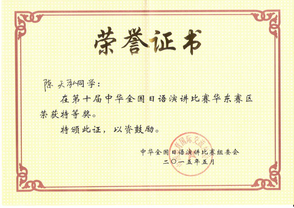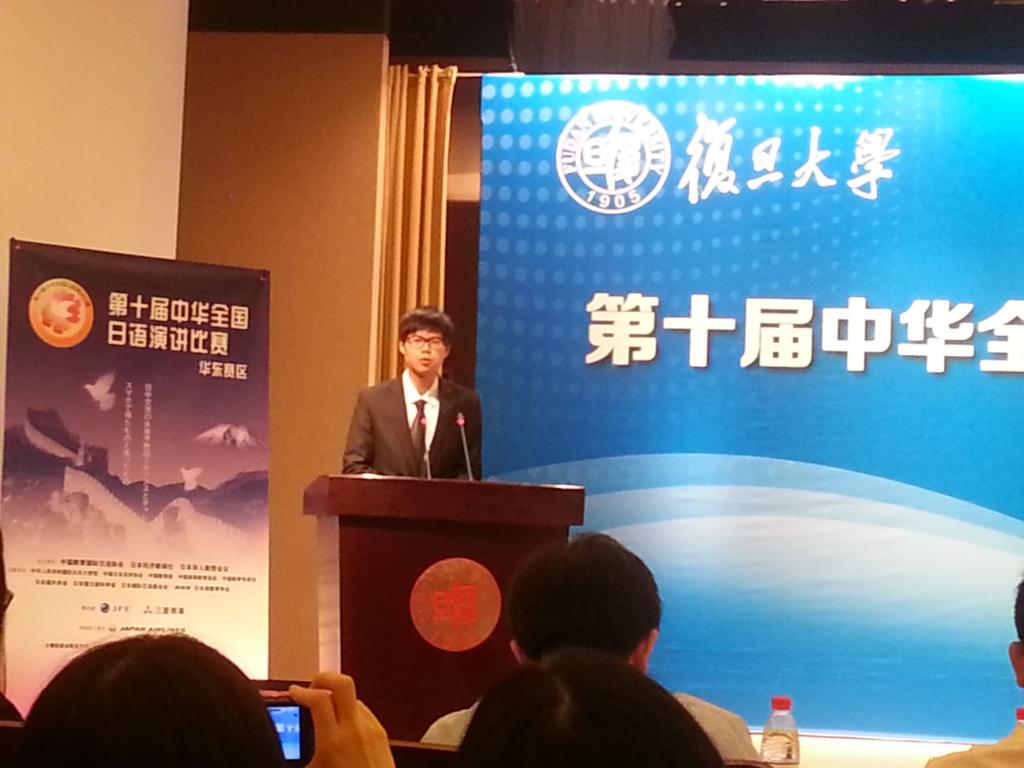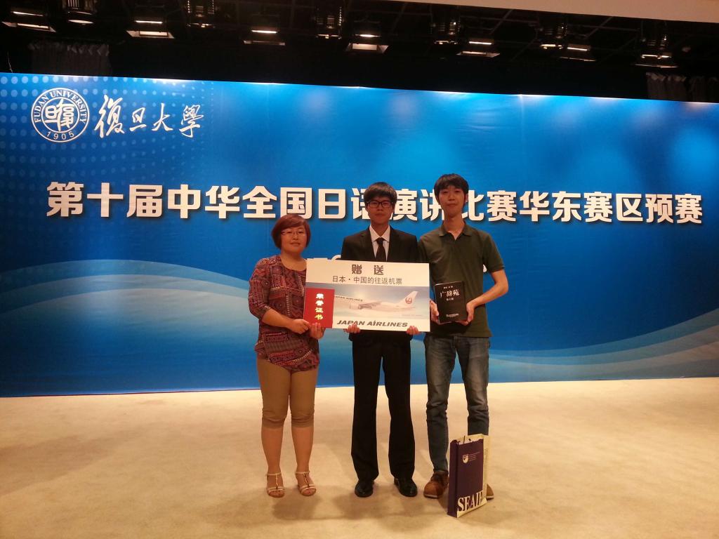 2015年06月13日,第十届中华全国日语演讲比赛华东赛区预赛在复旦大学举行,来自复旦大学、上海交通大学、上海江南在线大学、浙江大学、南京师范大学、南昌大学等华东地区21所高校的参赛选手经过激烈角逐,共有8名同学获得不同奖项。我校2013级日语专业陈天泓同学发挥出色,力克华东地区多位名校的优秀代表选手,最终以优异的成绩获得了特等奖,崔明姬老师也获得了优秀指导教师奖,为我校争得了荣誉。这是日语系学子在该项赛事中取得的第二次特等奖。