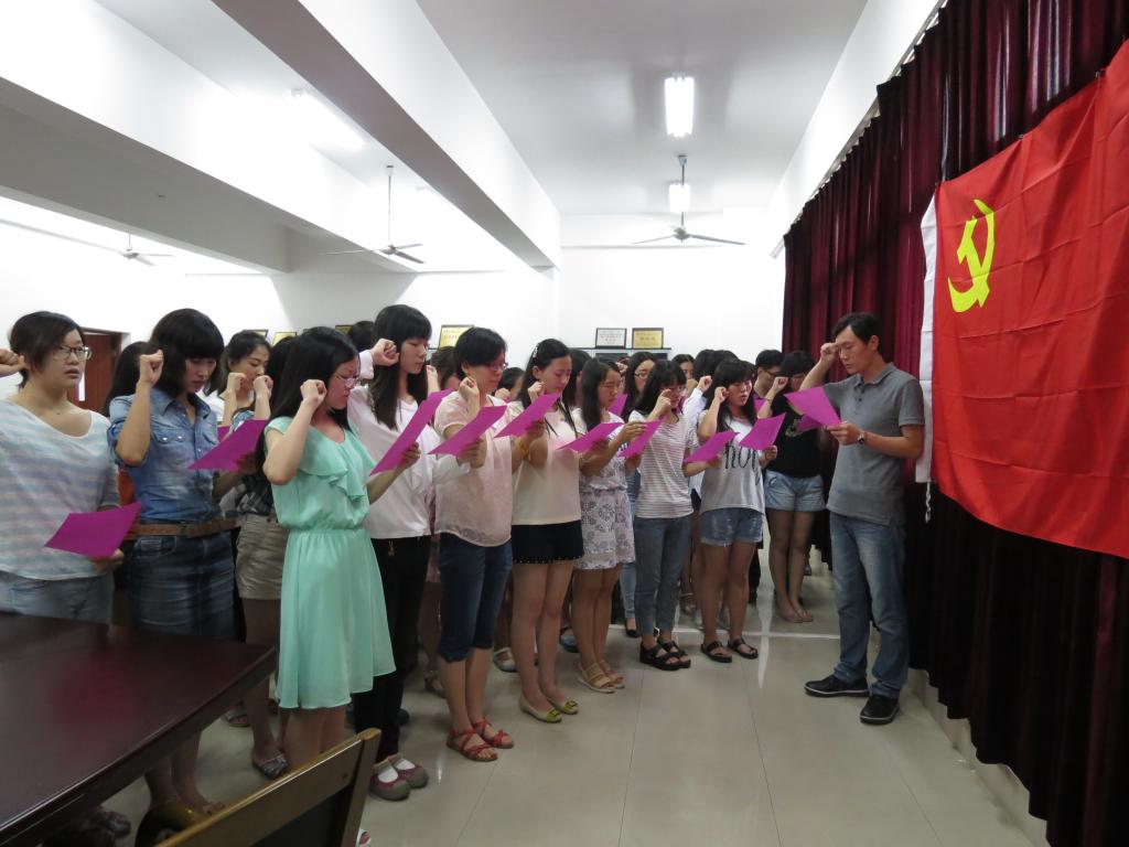 月30日下午,2015年江南在线学院新党员“七一”宣誓大会在文科楼A349会议室举行。学院党委副书记赵莹、党委秘书许广玉、12级党支部书记王琰玲、13级党支部书记林天飞以及全体新党员参加仪式,仪式由王琰玲老师主持。