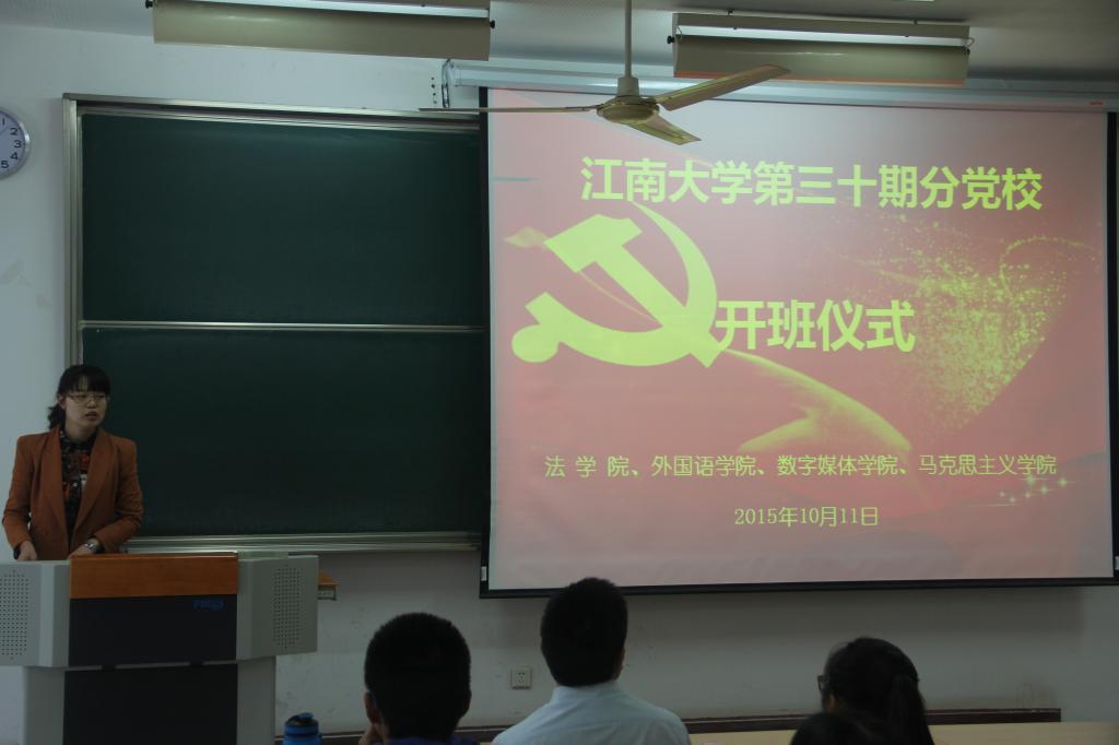 20151011日上午,江南大学江南在线学院、法学院、数媒学院、马克思主义学院第三十期分党校开班仪式在2c203举办了隆重举行。江南在线学院党委副书记赵莹、数媒学院党委副书记王维青以及相关辅导员出席了此次开班仪式。四学院共92名学员参加了此次分党校的培训。