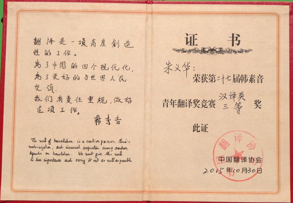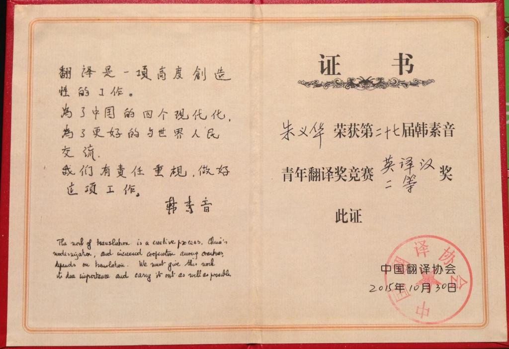 据了解,此次大赛共收到有效参赛译文2046份,其中英译汉译文1221份,经过初审、复审和终审,评出获奖译文71篇;汉译英有效825份,评出获奖译文48 篇。我院教师朱义华博士获本届大赛英译汉组二等奖与汉译英组三等奖,成为了本届参赛选手中唯一获此殊荣的参赛选手,这也是朱老师第八次获得该项赛事的大奖。