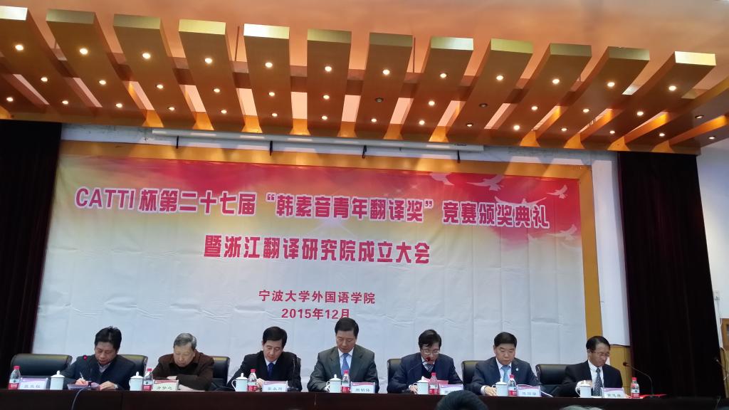 12月5日,CATTI杯第27届韩素音青年翻译奖竞赛颁奖典礼暨浙江翻译研究院成立大会在宁波大学举行,中国外文局局长、中国翻译研究院院长、中国翻译协会会长周明伟,宁波大学党委书记郭华巍,中国外文局国际合作部主任、中国译协常务副秘书长姜永刚,《中国翻译》杂志副主编、中国翻译协会翻译理论与翻译教学委员会副主任兼秘书长杨平,宁波市外事办公室副主任陈国苗,国务院学位委员会“江南在线言文学”学科评议组成员、广东外语外贸大学教授、博士生导师、珠江学者特聘教授黄忠廉教授,中国资深翻译理论家、上海大学方梦之教授,新加坡南洋理工大学教授谭慧敏等领导与专家出席了颁奖典礼。大赛评审委员会的部分专家、学者、大赛获奖选手和相关代表参加典礼。