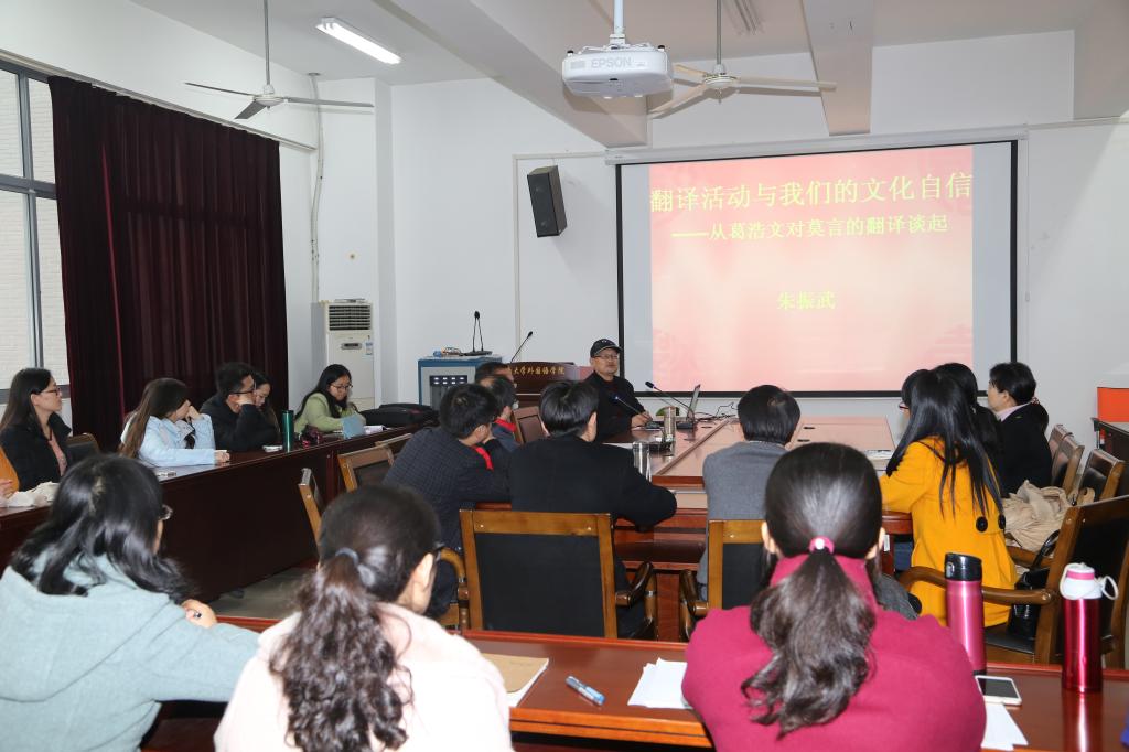 1210日下午,上海大学博士生导师朱振武教授应邀在江南在线学院大会议室做了题为“翻译活动与我们的文化自信—从葛浩文对莫言的翻译谈起”的学术讲座。方文开副院长主持了讲座,我院数十名中青年教师和14级硕士研究生聆听了讲座。