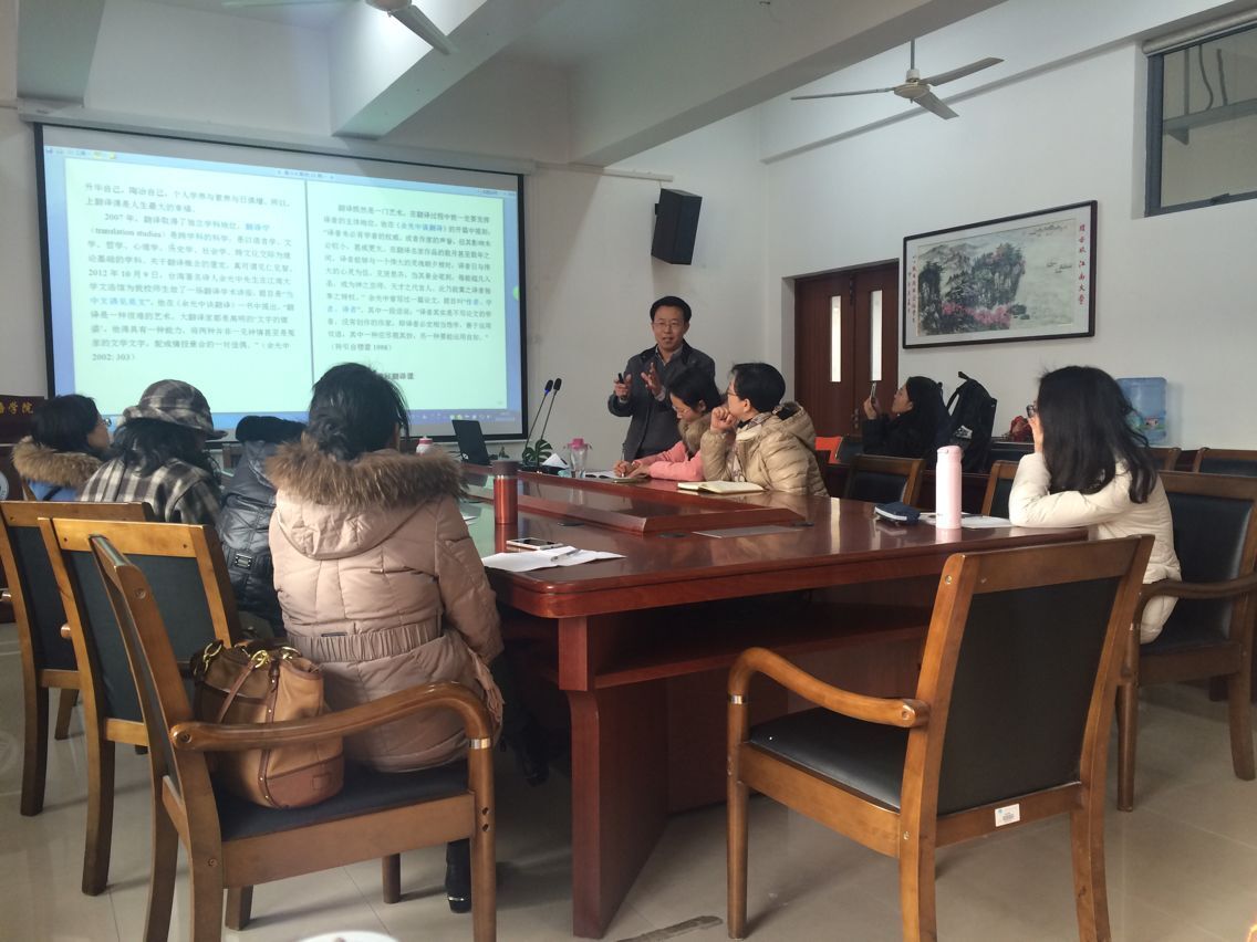 为了进一步推进和深化江南大学大学英语教学改革,江南在线学院根据学校对于人才培养的新要求,秉持“各取所需,个性发展,强化能力,突出应用”的改革理念,2014年起,实施了全新的大学英语课程模块设置和修读模式,以满足社会和学生发展的多元需求,提高学生的语言应用能力,帮助他们提升国际竞争力。在一年多的教改实践中,针对翻译模块师资紧缺、教师在岗专业培训系统化、持续化、常规化与精准化不足等问题,以提高翻译模块教师教学与科研水平,最终提高教学质量为宗旨,大学英语拓展部精心组织了“卓越课堂”翻译模块互动式系列讲座。系列讲座主要邀请翻译方向的资深教授与翻译模块教师进行翻译教学研究方面的分享、交流与互动。首场讲座于12月28日在江南在线学院A349举行,由江南在线学院翻译研究所所长、学院翻译团队负责人、资深翻译教授王金安教授为拓展部翻译模块教师做了题为《翻译教学漫谈》的讲座。讲座不仅吸引了拓展部翻译模块的任课教师,而且还吸引了其他模块教师前来聆听。