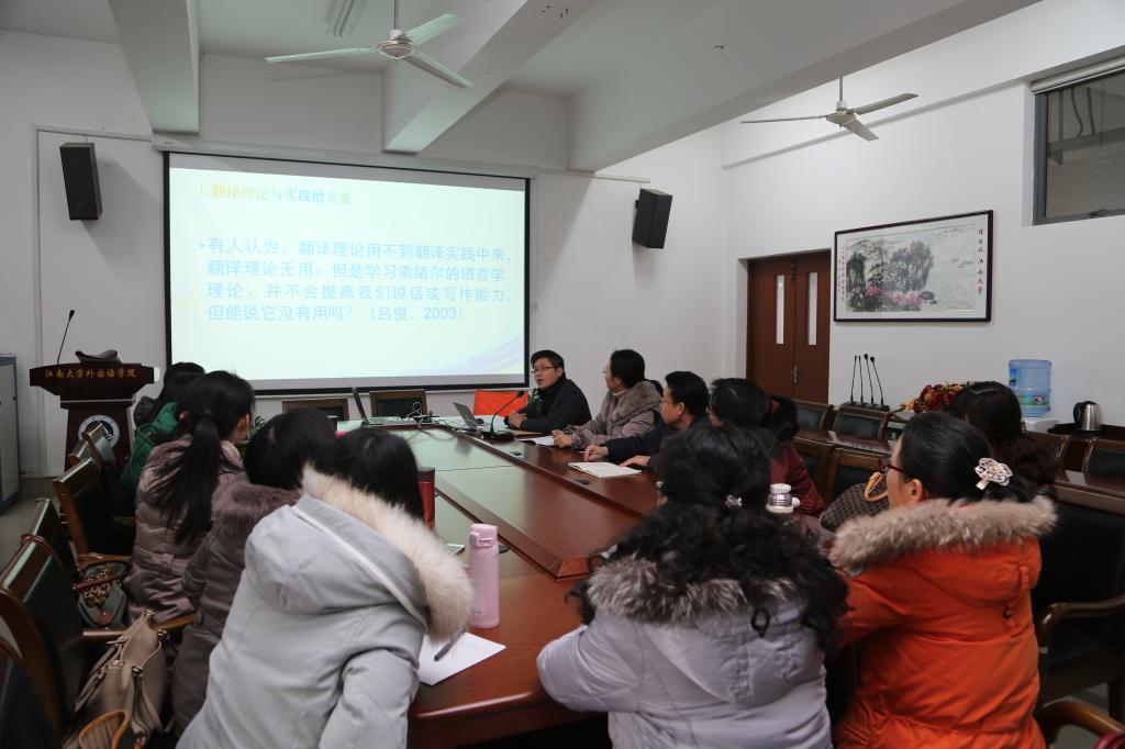江南在线学院“卓越课堂”翻译模块互动式系列讲座第二场在拓展部翻译组教师们的期盼中于2016年1月12日下午在江南在线学院A349准时开讲了。主讲人为资深翻译教授孙志祥老师,讲座题目是《翻译理论在翻译教学中的应用》。