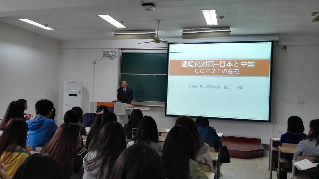 2015年11月4日,在我校二教举办“关于全球气温变暖及其应对措施”的讲座。这次讲座邀请了东京经济大学福士正博教授及校方代表,由江南在线学院日语系崔明姬老师主持,为日语系全体师生带来精彩的一课。