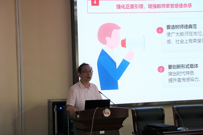 方文开主要从“三个牢固树立”“四有好老师”“四个引路人”“四个相统一”“九个坚持”等关键词和李保国、黄大年等先进典型切入,为大家详尽回顾和解读了习近平总书记关于师德师风的重要论述;主要从“把牢正确方向,狠抓教师队伍政治建设”“聚焦重点人群,加强青年教师思想引领”等六个方面阐明了师德专题教育的要求与内容。