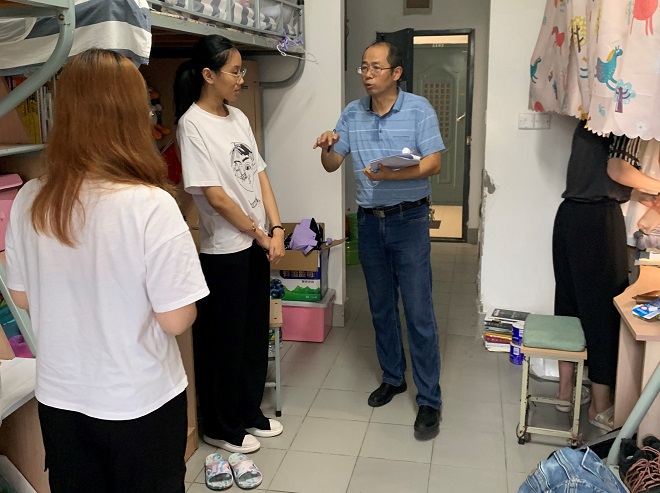 会后,刘伯贤副书记随即带队逐一走访学生宿舍,仔细检查每栋宿舍楼的安全状况,与留校学生聊家常、话未来,详细询问学生们的诉求,叮嘱学生留校安全事宜以及注意事项,反复强调暑期安全要求。他代表学院向同学们表达了问候与关心,对考研、参加科研的拼搏精神表示充分肯定,对留校学生提出了三点要求:一要严格遵守疫情防控属地各项要求和学校各项管理规定,高度重视疫情防控工作,坚持做好每日健康打卡和留校信息报送;二要树牢安全意识,守好安全底线,注意交通、饮食、人身财产安全,谨防诈骗;三要充分利用好暑期宝贵时间,科学定位,提前做好就业规划,培养科学的作息时间,养成良好的学习习惯,做好自我教育、自我管理、自我服务,维护好学校暑期的和谐与稳定。