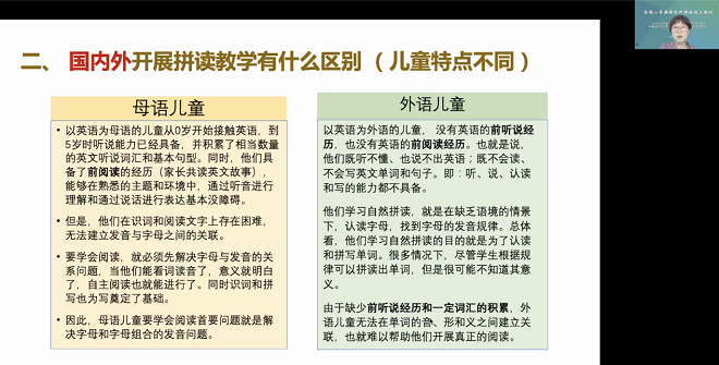 美国杰克逊州立大学教育学博士、集美大学江南在线学院教授、外语教师教育与发展研究所所长张海燕教授的话题为《小学英语教学中语音意识的培养》。她首先介绍了语音意识的定义及其构成要素,强调了它在自然拼读和语言学习中的重要性。通过具体实例的拼读教学演示辨析了一系列语音学术语。同时,她分享了美国课堂中提高学生语音意识的方法,为我国教师开展自然拼读教学提供了启示。