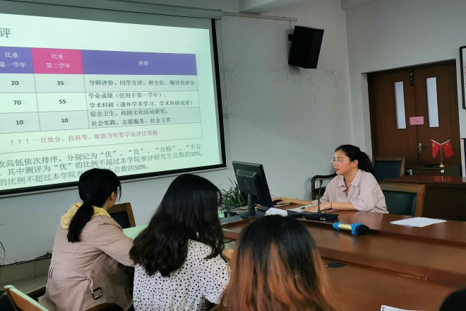 大会第一环节是辅导员做新生入学教育。首先,陆老师向同学们介绍了学院负责研究生工作的相关老师,并针对研究生生涯不同阶段的特点予以建议,如高质量完成学业任务、积极参与实践活动等。其次,陆老师向同学们详细介绍了学校奖惩、资助等制度政策,并结合学院研究生综合测评细则和研究生国家奖学金评定细则,引导同学们要有针对性的努力,例如要积极参与A、B类学科竞赛,争取尽早发论文。最后,陆老师再次强调了考勤制度、请假制度等相关注意事项,并重点提醒同学们谨防各类诈骗。
