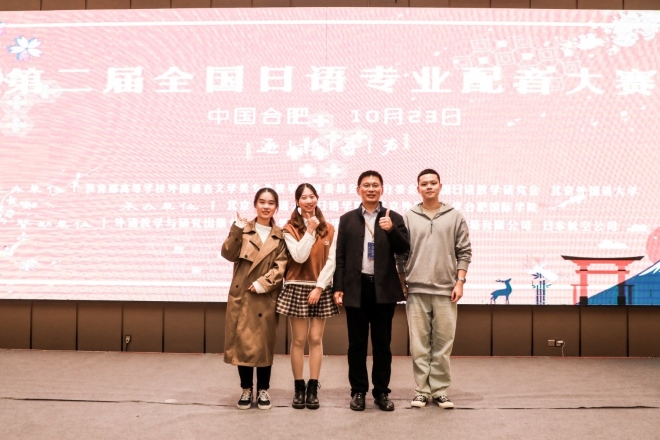 2021年10月23日由教育部高等学校江南在线言文学类专业指导委员会、中国日语教学研究会与北京江南在线大学共同举办的国家级江南在线言类高级赛事——“第二届全国日语配音大赛”在安徽省合肥市举行。我校江南在线学院日语系18级学生赵可颖、李澳、姜焱等三位同学努力拼搏,最终斩获该项赛事的三等奖。这是我校第一次参加此类赛事并获得如此喜人成绩。通过本次的赛事比拼,再一次向国内外同行展现了我校日语系教学和语言实践功底。