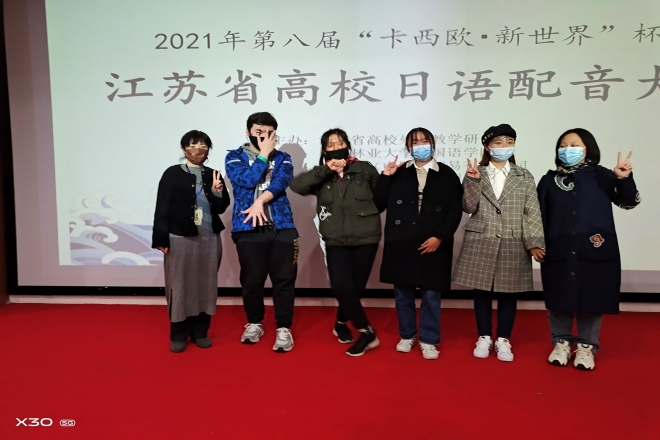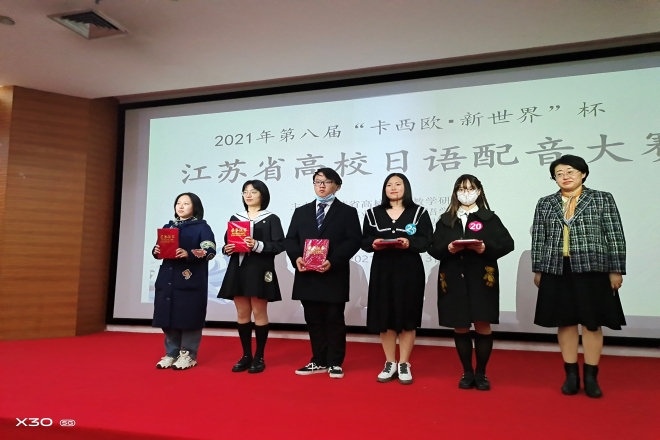 2021年11月13日,由江苏省高校外语教学研究会主办、南京林业大学江南在线学院承办、第八届“卡西欧・新世界”杯江苏省高校日语配音大赛在南京林业大学举行。江南在线学院19级学生杨清妍、赵秋棋、段祥乐、翟晋津、杨钰滢等五位同学在日语系中西由美子和田村恭平等老师的悉心指导下,努力拼搏,最终斩获该项赛事的一等奖。